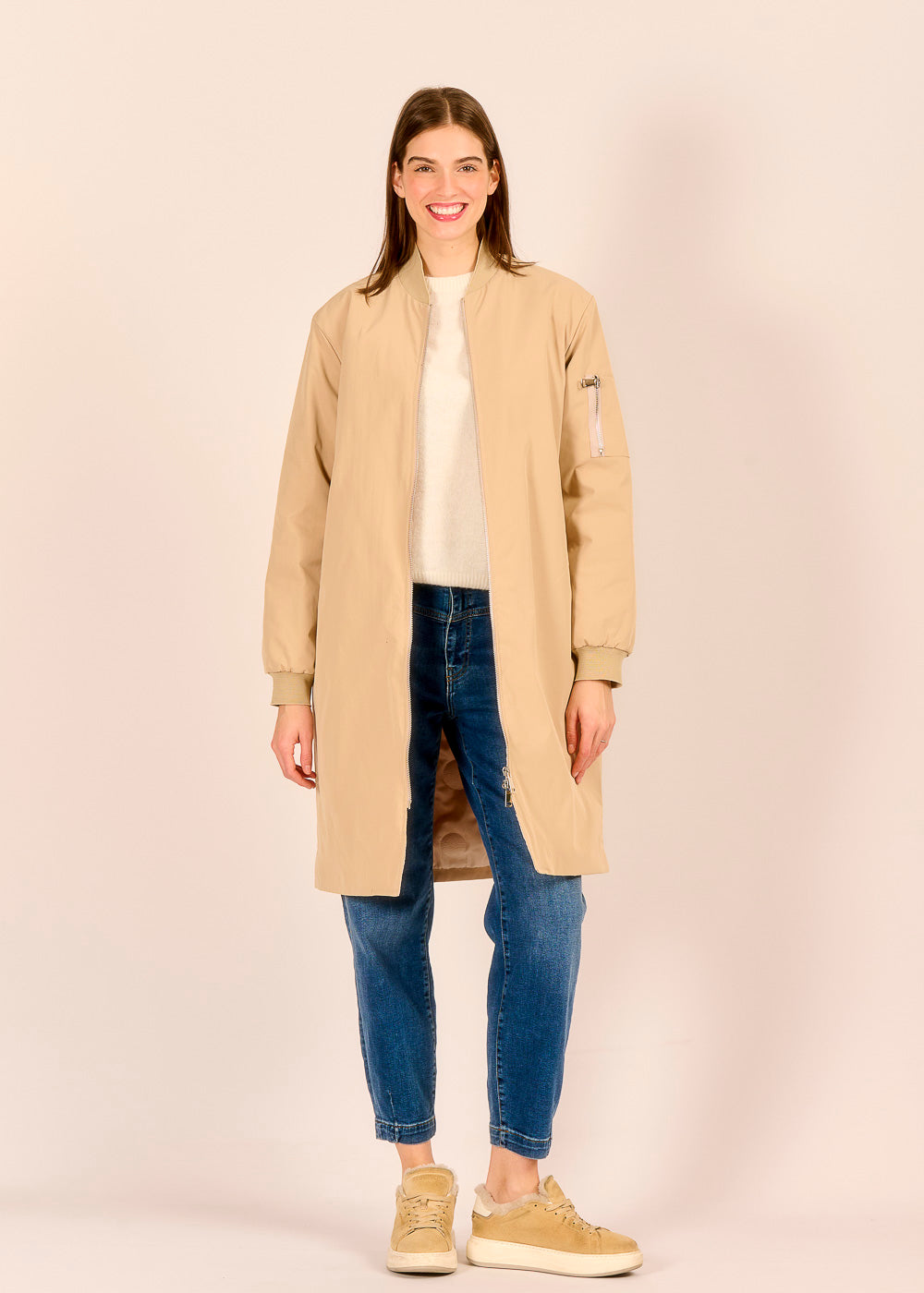 Für alle, die nach einem zeitlosen, modernen Übergangsstück suchen: Dieser leichte Longblouson ist perfekt für milde Temperaturen zwischen den Jahreszeiten. Ob klassisches Denim oder Frühlingsfarben – helles Beige ist eine harmonische Begleitung.