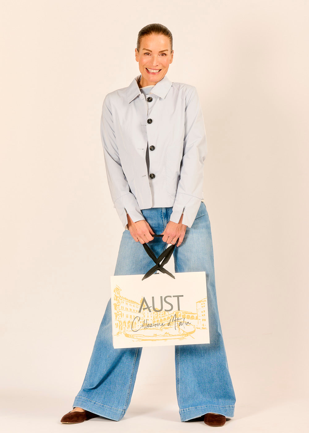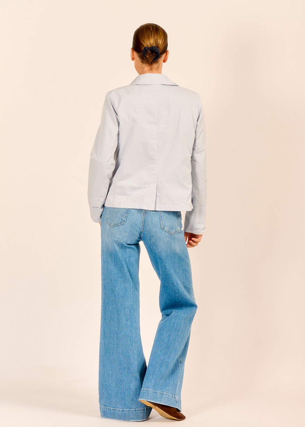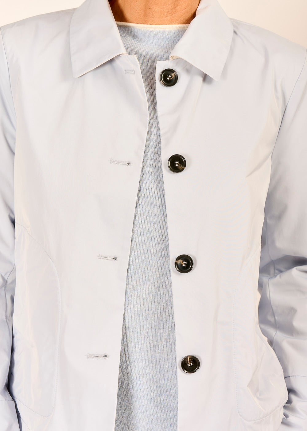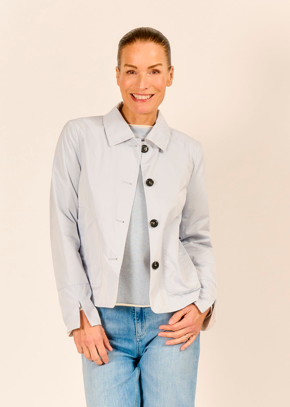 Die himmelblaue Blazerjacke mit Kragen vereint Eleganz und Leichtigkeit. Ob kombiniert mit Jeans für einen lässigen Look oder mit edler Pantalone für besondere Anlässe – sie verleiht jedem Outfit einen stilvollen Akzent.